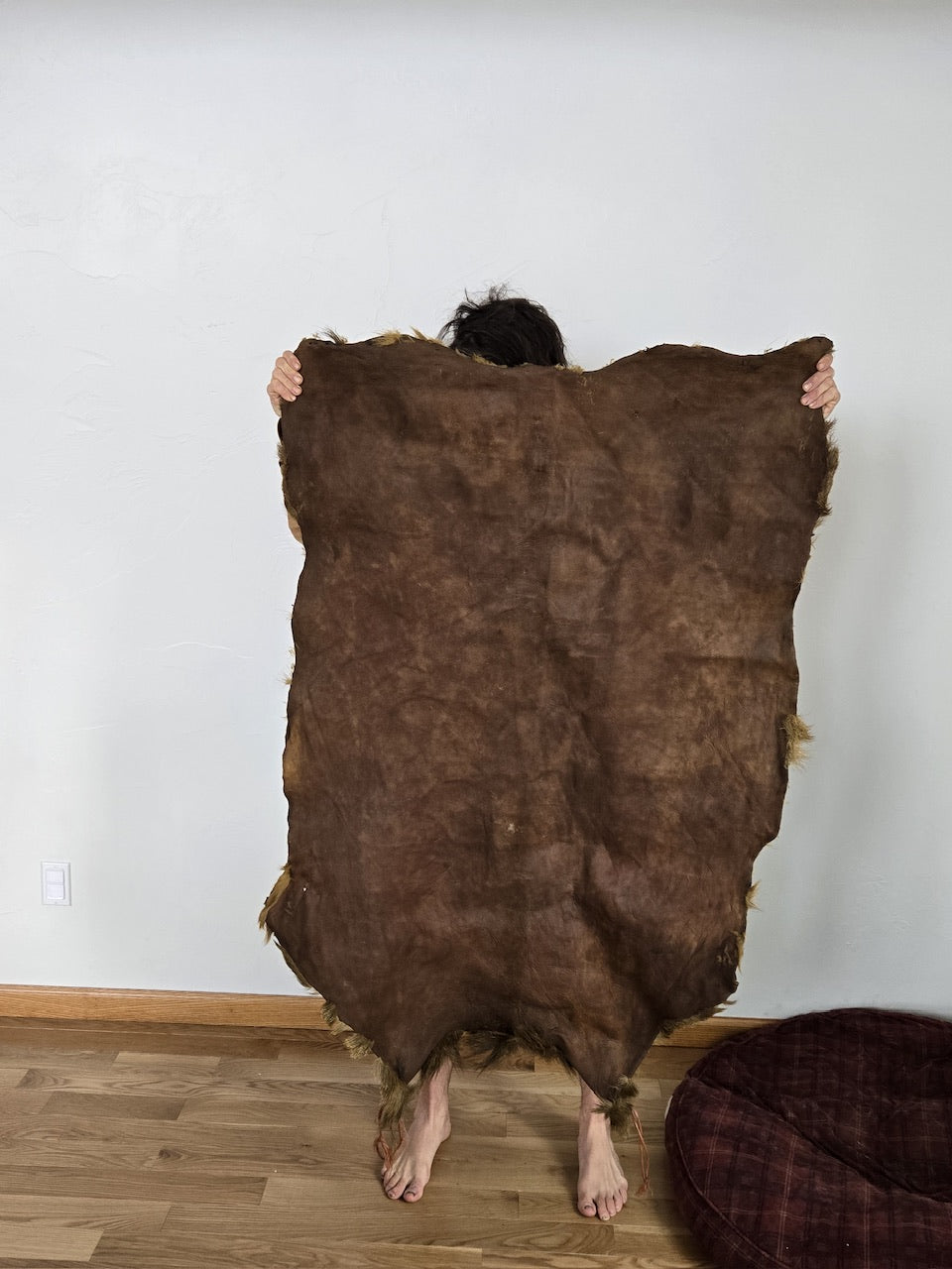 The membrane of hide, flesh side or non grain side, has a score mark along spine likely from trying to peel the hide from the spinal column. Otherwise this hide would make epic straps if cut in spirals around the hide.