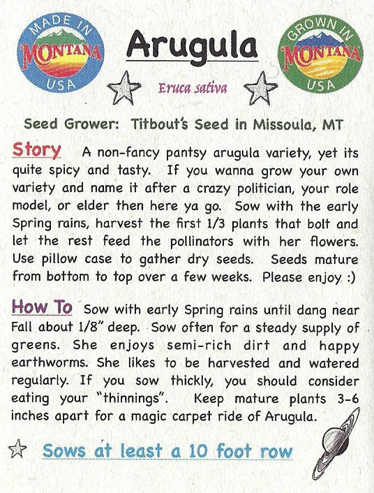A non-fancy pantsy arugula variety, yet its quite spicy and tasty. If you wanna grow your own variety and name it after a crazy politician, your role model, or elder then here ya go. Sow with the early Spring rains, harvest the first 1/3 plants that bolt and let the rest feed the pollinators with her flowers. Use pillow case to gather dry seeds. Seeds mature from bottom to top over a few weeks. Please enjoy :)