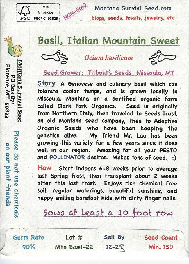 A Genovese and culinary basil which can tolerate cooler temps, and is grown locally in Missoula, Montana on a certified organic farm called Clark Fork Organics. Seed is originally from Northern Italy, then traveled to Seeds Trust, an old Montana seed company, then to Adaptive Organic Seeds who have been keeping the genetics alive. My friend Mr. Lau has been growing this variety for a few years since it does well in our region. Amazing for all your PESTO and POLLINATOR desires. Makes tons of seed. :)