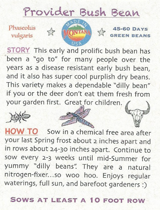 Sow in a chemical free area after your last Spring frost about 2 inches apart and in rows about 24-30 inches apart. Continue to sow every 2-3 weeks until mid-Summer for yummy “dilly beans”. They are a natural nitrogen-fixer…so woo hoo. Enjoys regular waterings, full sun, and barefoot gardeners :)