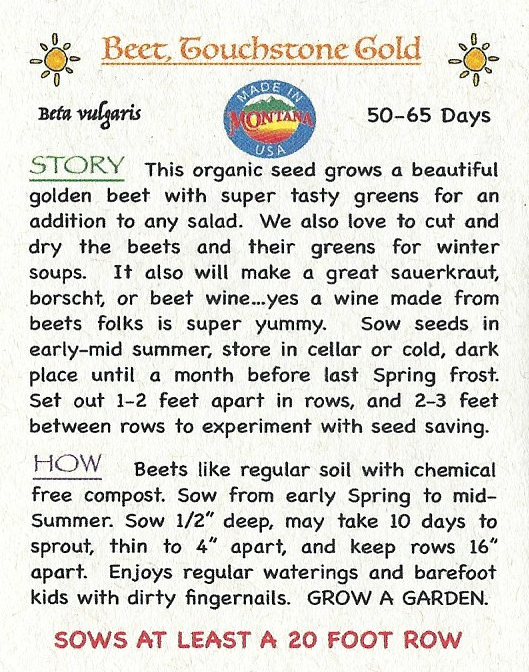 This organic seed grows a beautiful golden beet with super tasty greens that make a great addition to any salad. We also love to cut and dry the beets and their green for winter soups. They also make a great sauerkraut, borscht, or beet wine... yes a wine made from beets folks is super yummy. Sow seeds in early-mid summer, store in cellar or cold dark place until a month before last spring frost. Set out 1-2 feet apart in rows and 2-3 feet between row to experiment with seed saving.