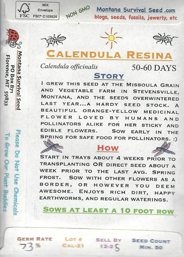 INFO: I grew this seed at the Missoula Grain and Vegetable farm in Stevensville, Montana. A beautiful orange and yellow medicinal flower loved by humans and pollinators alike for her sticky and edible flowers. Please provide a safe home and food for our pollinators.