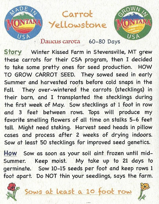 Winter Kissed Farm in Stevensville, MT grew these carrots for their CSA program, then I decided to take some pretty ones for seed production. HOW TO GROW CARROT SEED. They sowed seed in early Summer and harvested roots before cold snaps in the Fall. They over-wintered the carrots (stecklings) in their barn, and I transplanted the stecklings during the first week of May. Sow stecklings at 1 foot in row and 3 feet between rows. Tops will produce my favorite smelling flowers of all time on stalks 5-6 feet tall. Might need staking. Harvest seed heads in pillow cases and process after 2 weeks of drying indoors. Sow at least 50 stecklings for improved seed genetics.