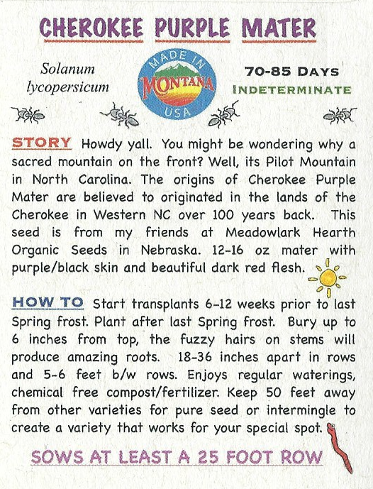 Indeterminate - Howdy yall. You might be wondering why a sacred mountain on the front? Well, it's Pilot Mountain in North Carolina. The origins of Cherokee Purple Mater are believed to originated in the lands of the Cherokee in Western NC over 100 years back. This seed is from my friends at Meadowlark Hearth Organic Seeds in Nebraska. 12-16 oz mater with purple/black skin and beautiful dark red flesh.