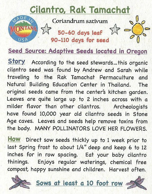 According to the seed stewards…this organic cilantro seed was found by Andrew and Sarah while traveling to the Rak Tamachat Permaculture and Natural Building Education Center in Thailand. The original seeds came from the center’s kitchen garden. Leaves are quite large up to 2 inches across with a milder flavor than other cilantros. Archeologists have found 10,000 year old cilantro seeds in Stone Age caves. Leaves and seeds help remove toxins from the body.