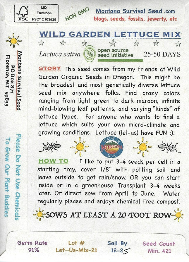 INFO: This seed comes from my friends at Wild Garden Organic Seeds in Oregon. This might be the broadest and most genetically diverse lettuce seed mix anywhere folks. Find crazy colors ranging from light green to dark maroon, infinite mind-blowing leaf patterns, and varying “kinds” of lettuce types. For anyone who wants to find a lettuce which suits your own micro-climate and growing conditions. Lettuce (let-us) have FUN :).