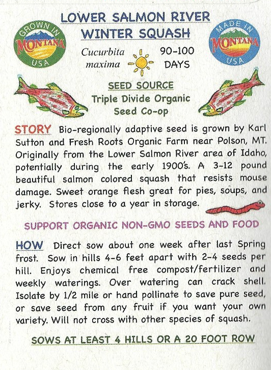 Bio-regionally adaptive seed is grown by Karl Sutton and Fresh Roots Organic Farm near Polson, MT. Originally from the Lower Salmon River area of Idaho, potentially during the early 1900’s. A 3-12 pound beautiful salmon colored hard shell which resists mouse damage. Sweet orange flesh great for pies, soups, and jerky. Stores close to a year in storage.