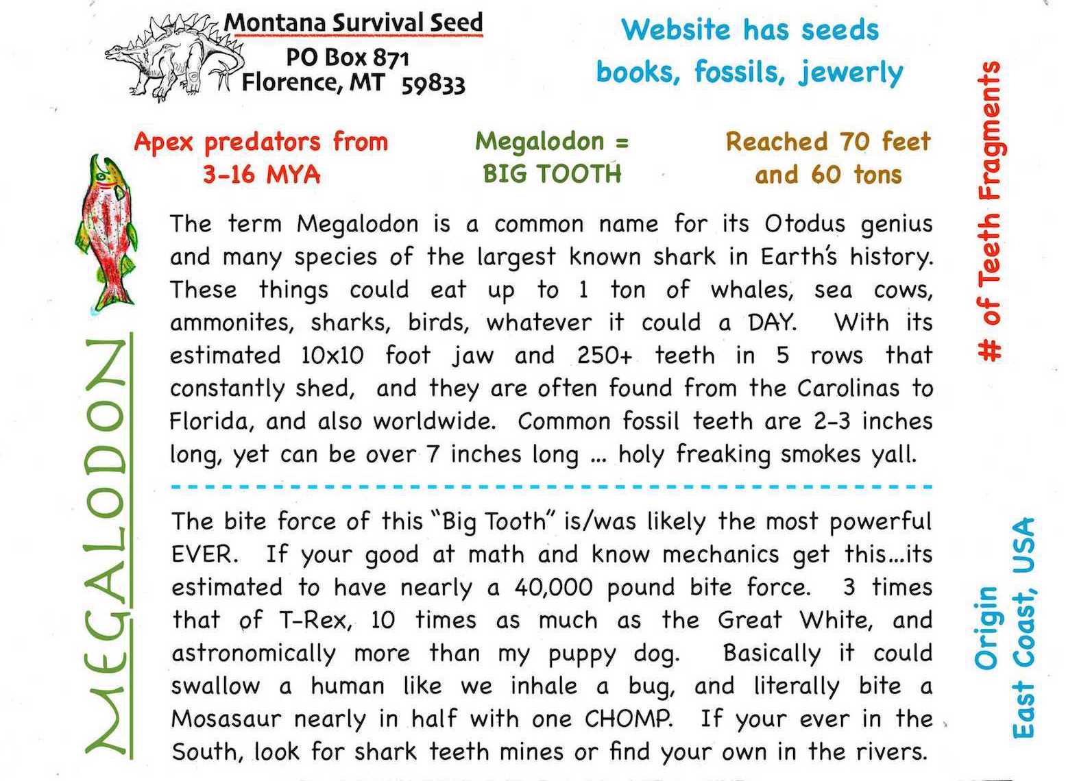 The term Megalodon is a common name for its Otodus genius and many species of the largest known shark in Earth’s history. These things could eat up to 1 ton of whales, sea cows, ammonites, sharks, birds, whatever it could a DAY. With its estimated 10x10 foot jaw and 250+ teeth in 5 rows that constantly shed, and they are often found from the Carolinas to Florida, and also worldwide. Common fossil teeth are 2-3 inches long, yet can be over 7 inches long … holy freaking smokes yall.