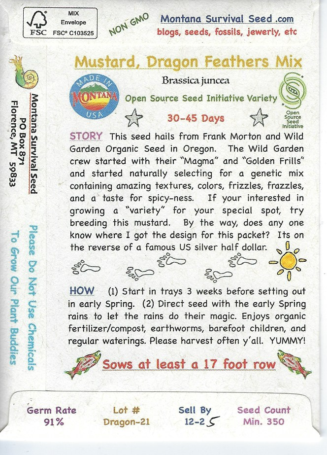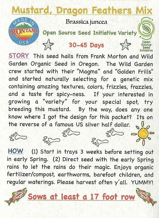 This seed hails from Frank Morton and Wild Garden Organic Seed in Oregon. The Wild Garden crew started with their "Magma" and "Golden Frills" and started naturally selecting for a genetic mix containing textures, colors, frizzles, frazzles, and a taste for spicy-ness. If you're interested in growing a "variety" for your special spot, try breeding this mustard. By the way, does any one know where I got the design for this packed? It's on the reverse of a famous US silver half dollar.