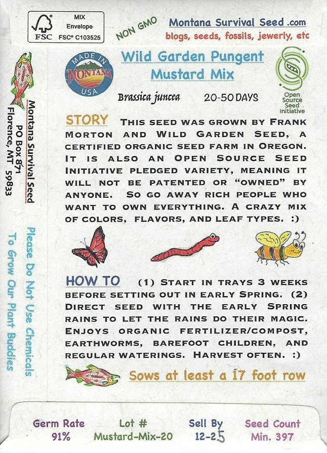 INFO: This mustard seed was grown at Wild Garden Seed in Oregon, a certified organic seed farm. It is also an Open Seed Source Initiative pledged variety, meaning it will not be patented or “owned” by anyone. So go away rich people who want to own everything. A crazy mix of colors, flavors, leaf types, and awesome for diversity. Spicy and flavorful. :)