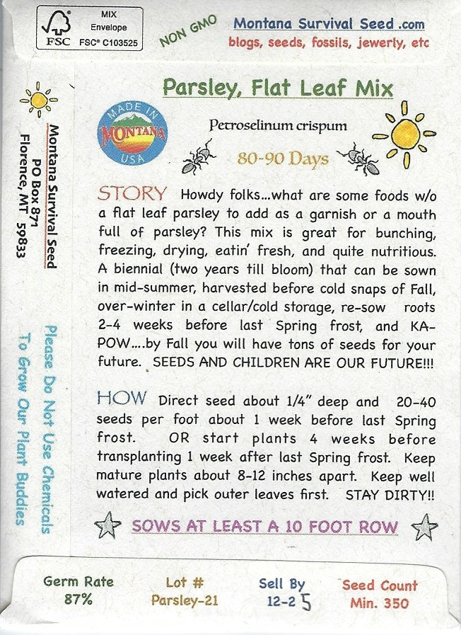 Howdy folks…what are some foods w/o a flat leaf parsley to add as a garnish or a mouth full of parsley? This mix is great for bunching, freezing, drying, eatin’ fresh, and quite nutritious. A biennial (two years till bloom) that can be sown in mid-summer, harvested before cold snaps of Fall, over-winter in a cellar/cold storage, re-sow roots about 2-4 weeks before last Spring frost, and KA-POW….by Fall you will have tons of seeds for your future.